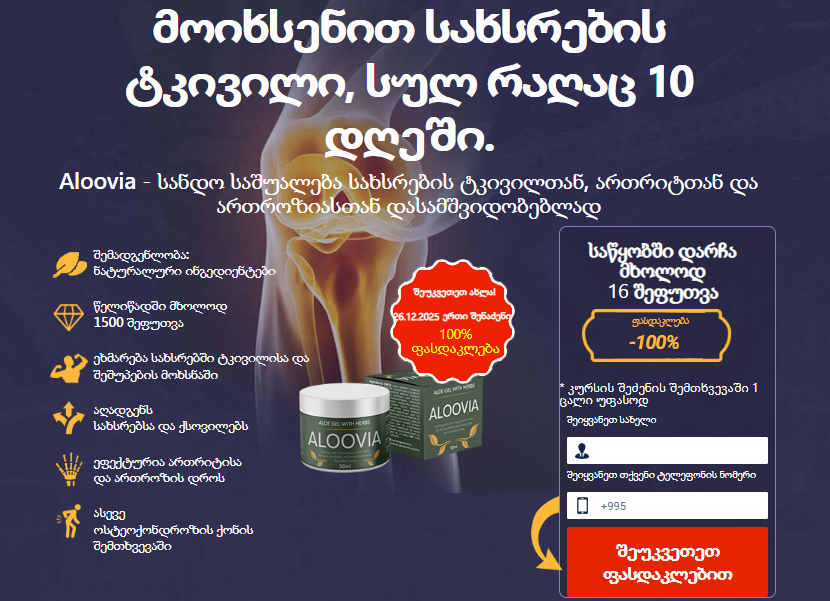 Aloovia ფასი Georgia – ალოვია არის დახვეწილი ბუნებრივი თერაპია, რომელიც აქრობს ტკივილს და აძლიერებს, აპოხავს, აჭიმავს და აძლიერებს სახსრებს. ეს არის მომენტი, როდესაც შეგიძლიათ დატკბეთ თქვენი ახალგაზრდობით, როგორც ხანდაზმული ადამიანისთვის და დაემშვიდობოთ მოთმინებას, რადგან ფეხები, მუხლები ან სახსრები გტკივათ. ეს აღარ შეგიშლით ხელს ცხოვრებაში და თქვენ უმეტესად დატკბებით მისით.