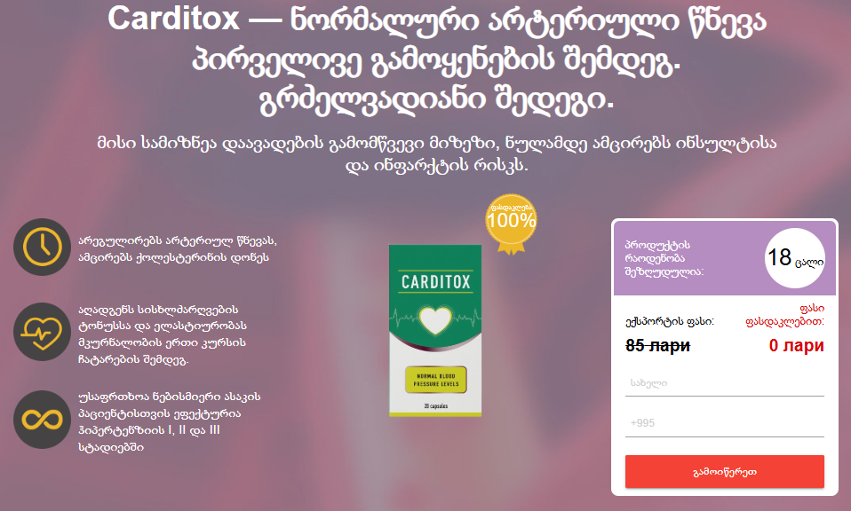 კარდიტოქსს შეუძლია შეამციროს არტერიული წნევა და დაგეხმაროთ სიმპტომებისა და სხვა ჯანმრთელობის პრობლემების მოგვარებაში. შეგიძლიათ ენდოთ ამ გამოსავალს. შეკვეთისთვის დააწკაპუნეთ ქვემოთ მოცემულ სურათზე. შეავსეთ თქვენი ინფორმაცია ფანჯარაში. ჩვენი წარმომადგენელი დაგიკავშირდებათ კონსულტაციისთვის.