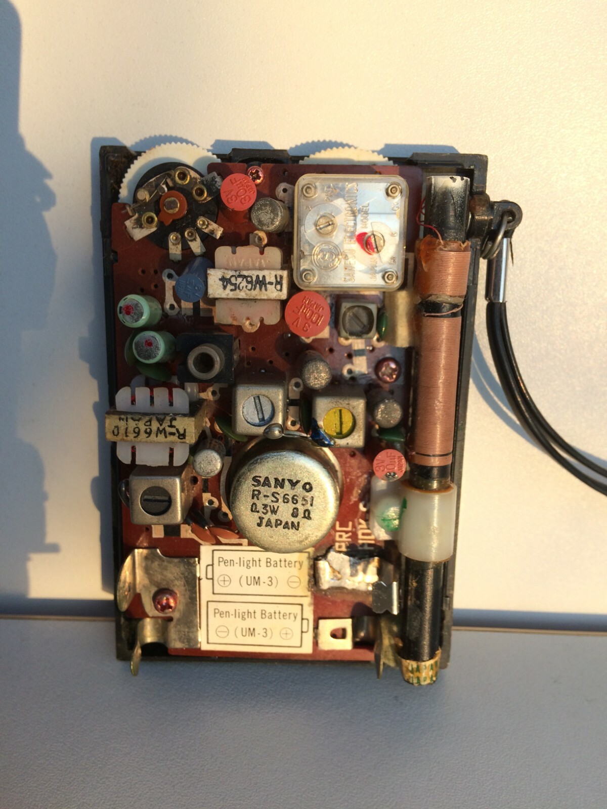 Sanyo 6C-341 idem RP 1100 Radio 6 Transistor AM Portable Radio Poket with Superheterodyne years 70s TEST volume,switches,WORKING PERFECT its O.K. !!Catch ALL radio stations across the range AMCLEAR and Loud sound !!Sanyo Electric Co. Ltd.; Moriguchi (Osaka) Freq. range 530-1605 kHz , I.F. 455kHzSemiconductors (the count is only for transistors) 6: 2SA329 2SA329 2SA329 2SA329 2SB187 2SB187Main principle Superheterodyne (common)Wave bands Broadcast only AM (MW).Details Power type and voltage : Dry Batteries R6/AA 3V / 2 x 1,5 VoltPower Loudspeaker : Permanent Magnet Dynamic (PDyn) Loudspeaker (moving coil) Very small Portable or Pocket-Set (Handheld) 8 inch.- battery case clean- exterior body has some spots,scratches,pinched cover edge back down and one terminal battery is changed but good working>> look last photos-