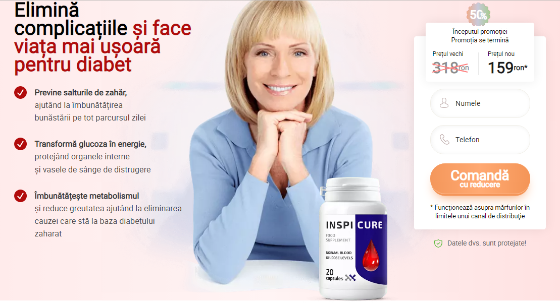 Capsulele Inspicure includ doar componente naturale și sunt concepute pentru a îmbunătăți echilibrul de glucoză și carbohidrați al organismului, precum și metabolismul. Capsulele filmate vă pot ajuta să vă reduceți greutatea și pofta de mâncare, ceea ce este destul de util în gestionarea simptomelor diabetului. Pe site-ul oficial al producătorului, puteți profita de reduceri substanțiale de preț, confirmând totodată că ingredientele sunt de bună calitate. România a vândut deja mai mult de copii ale cărții. Opiniile și comentariile de pe forumurile online oferă dovezi că vindecarea este benefică în tratamentul bolilor endocrinologice. Mărturiile nu conțin preocupări cu privire la contraindicațiile care au fost furnizate.