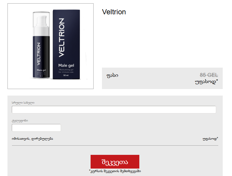 Veltrion-ს მხოლოდ ოფიციალური ვებსაიტი ყიდის. შეავსეთ შეკვეთის ფორმა ოფიციალურ გვერდზე და განათავსეთ თქვენი შეკვეთა. ფასდაკლებები და სპეციალური შეთავაზებები შეიძლება ამოიწუროს.